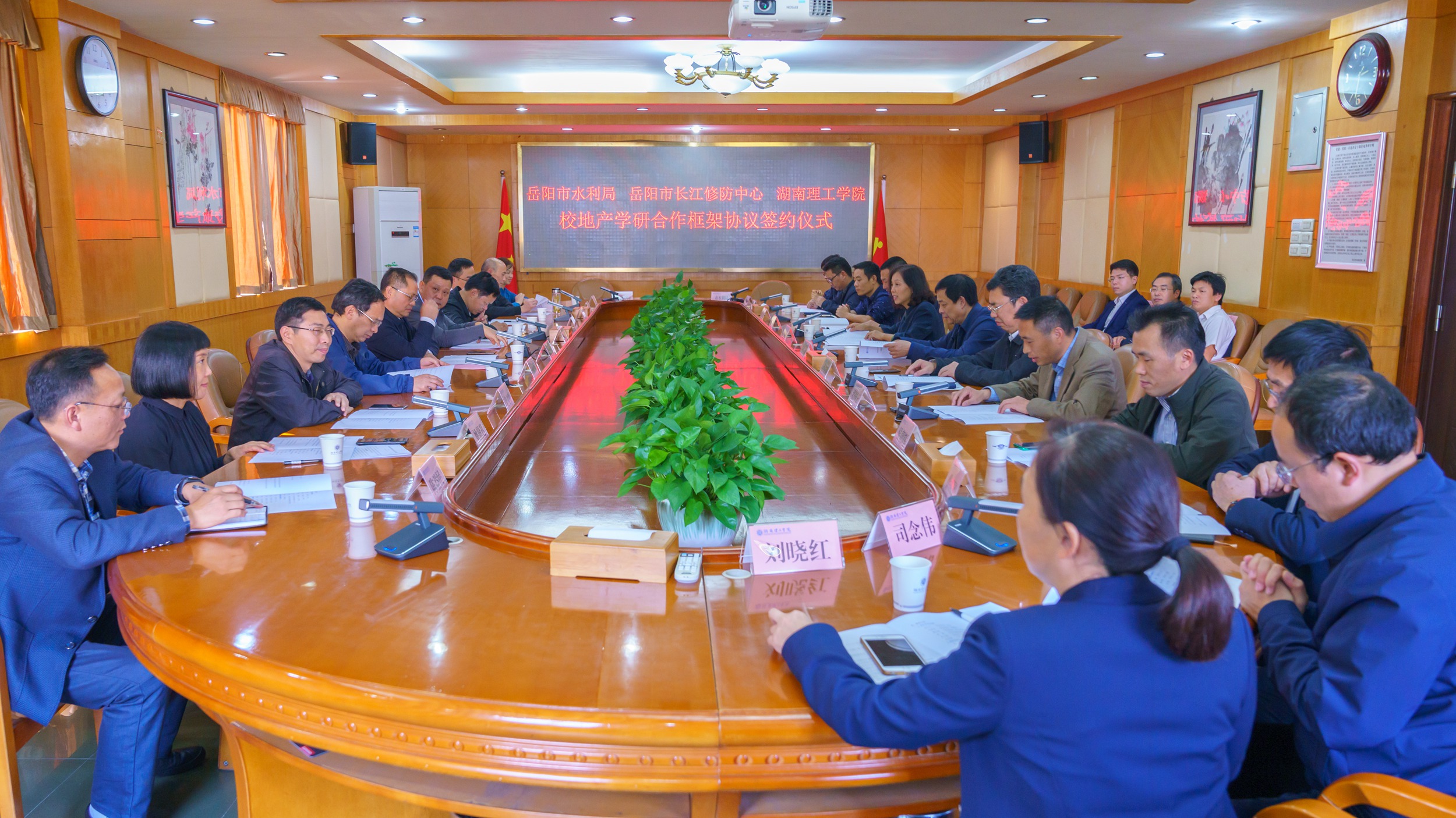 校长卢先明与岳阳市水利局、岳阳市长江修防中心负责人分别签署了《校地产学研合作框架协议书》