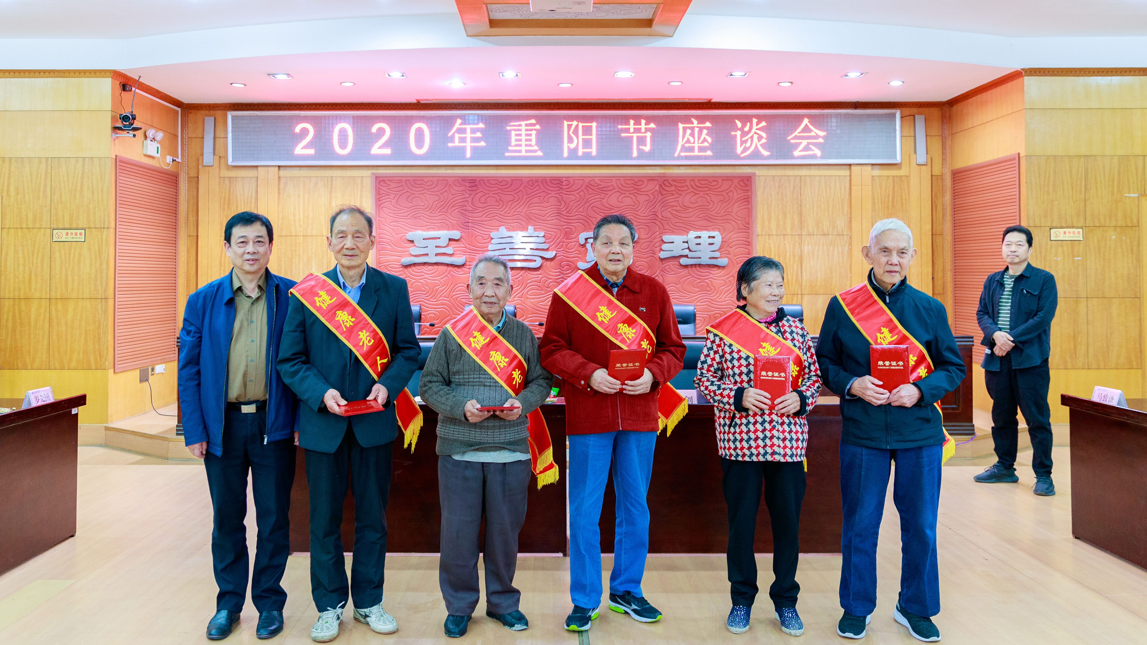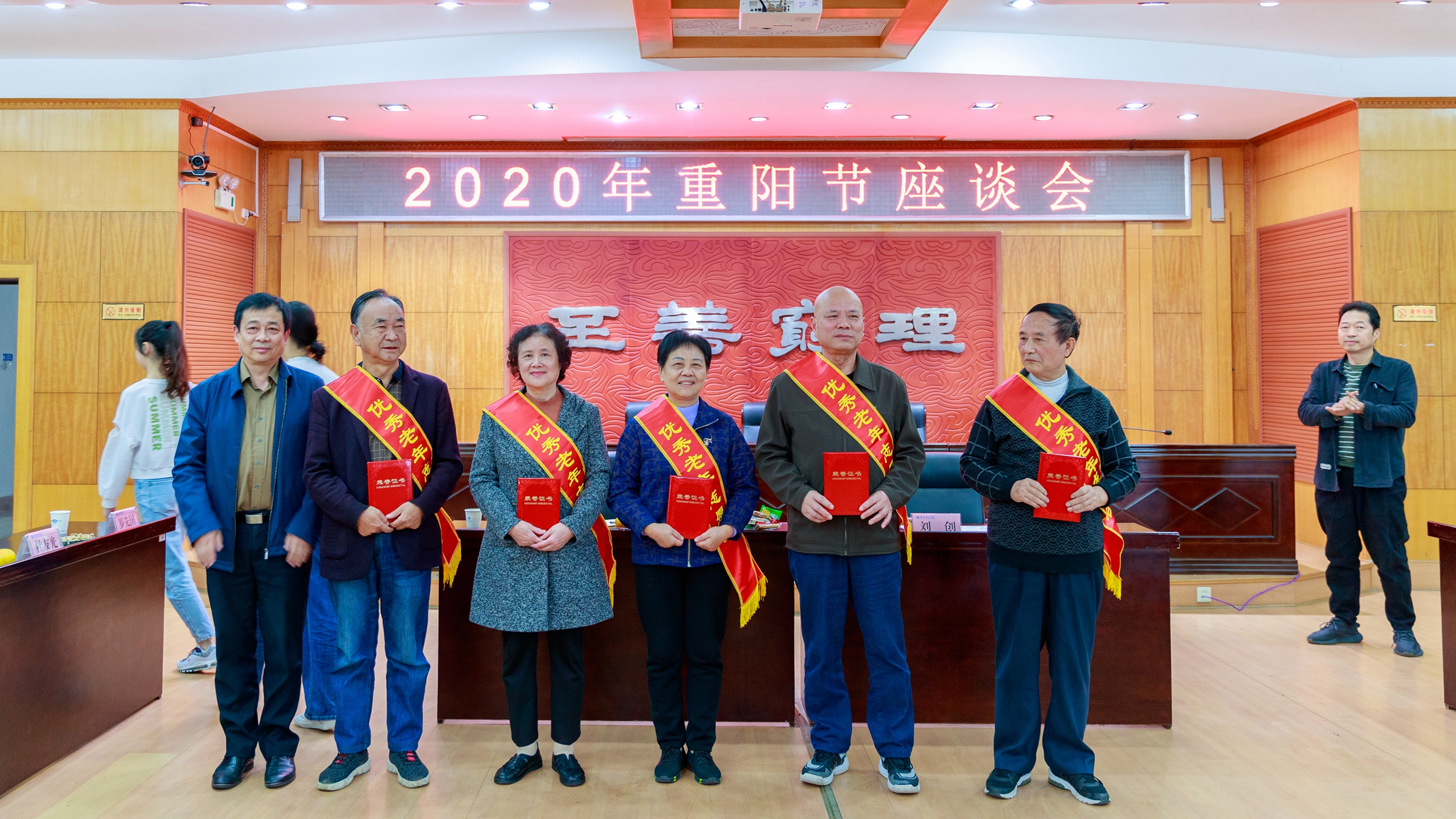 会上,学生志愿者为五位“健康老人”与五位“优秀老年工作志愿者”戴上绶带,李明为他们颁发荣誉证书并合影留念。