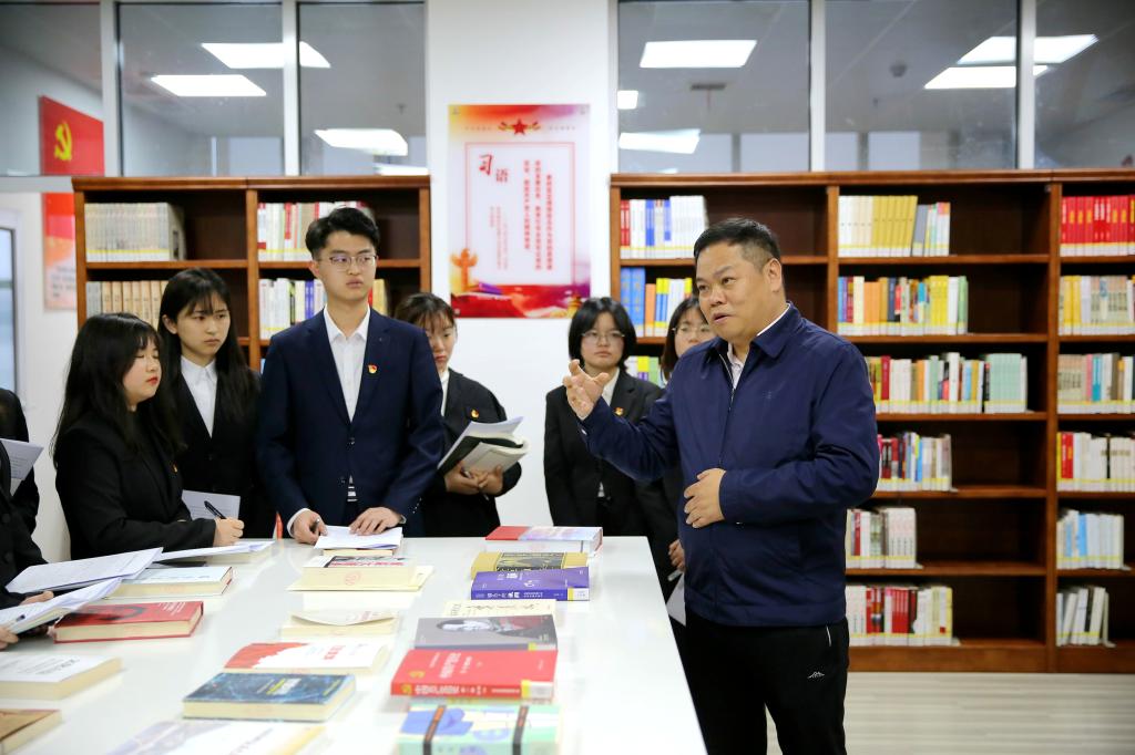 宣讲报告结束后,汤建军来到图书馆红色书屋与同学们交流党史学习