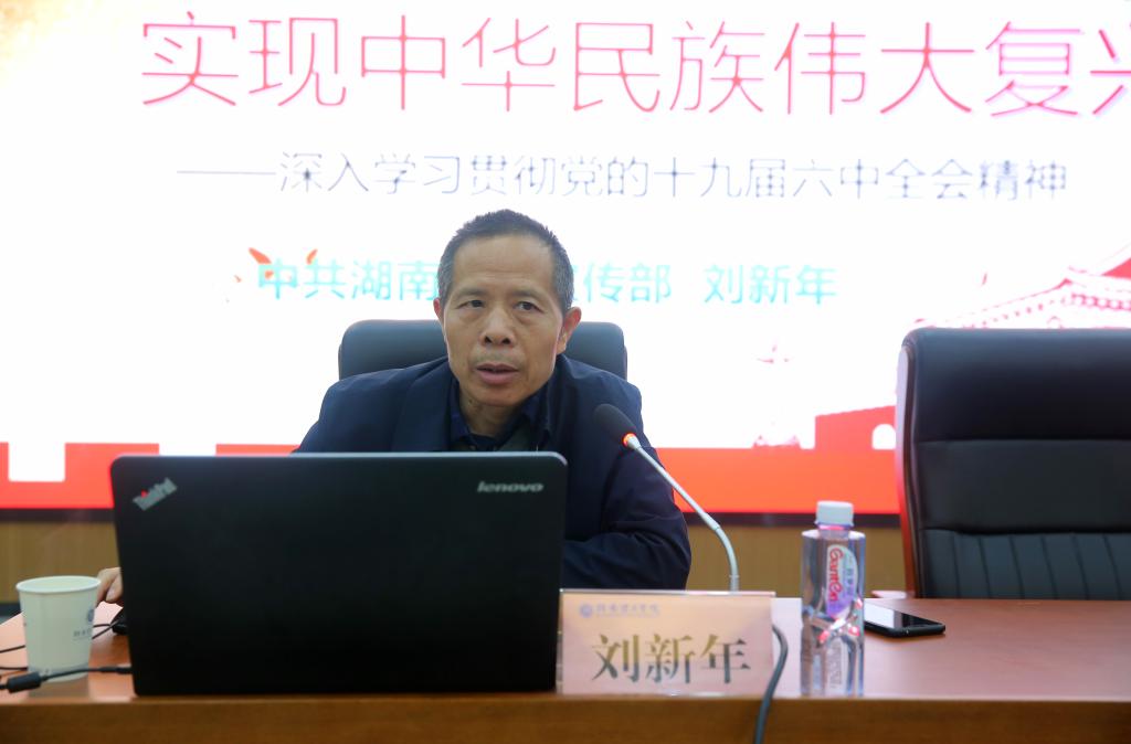 校园网讯 12月8日下午,学校举行学习贯彻党的十九届六中全会精神省委宣讲团报告会暨党委理论学习中心组2021年第16次集体(扩大)学习,省委宣讲团成员、省委宣传部部务会成员、二级巡视员刘新年就党的十九届六中全会精神作宣讲。党委书记卢先明主持报告会。刘新年紧紧围绕学习贯彻习近平总书记在党的十九届六中全会上的重要讲话精神和《中共中央关于党的百年奋斗重大成就和历史经验的决议》,从深刻认识总结党的百年奋斗重大成就和历史经验的重大意义、深刻认识党的百年奋斗的初心使命和重大成就、深刻认识中国特色社会主义新时代的历史性成就和历史性变革、深刻认识党的百年奋斗的历史意义和历史经验、深刻认识以史为鉴开创未来的重要要求、从党的百年历程中汲取智慧和力量六大方面全面进行了深入解读。