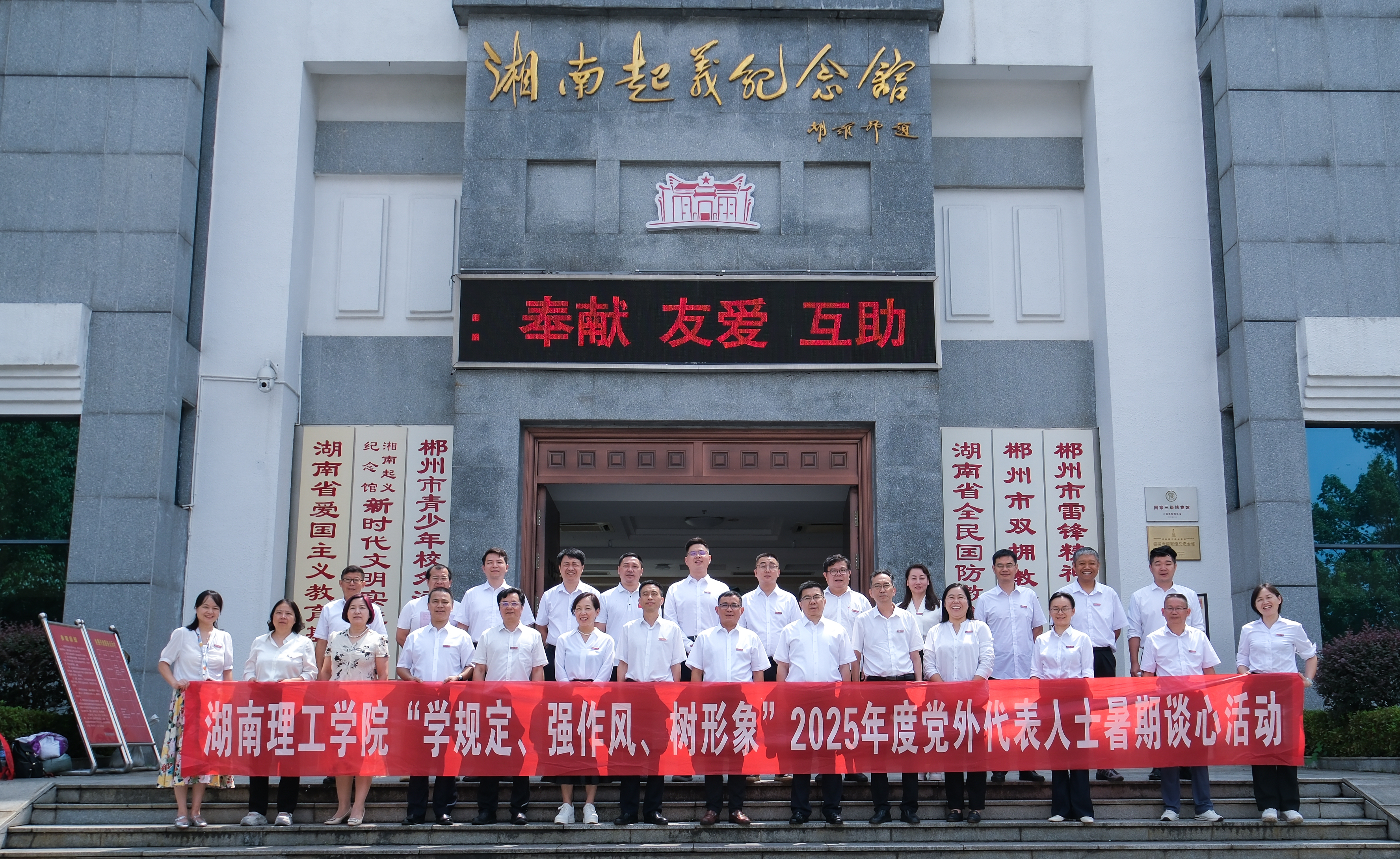校园网讯 为进一步强化思想政治引领,深入贯彻落实“学规定、强作风、树形象”主题教育要求,进一步强化党外人士纪律规矩意识,加强党外代表人士队伍建设,7月28日至30日,学校组织党外代表人士,赴郴州开展以“学规定 强作风 树形象”为主题的暑期集中谈心活动,通过专题学习、实地研学与深入谈心相结合的形式,着力提升党外人士的政治素养与履职能力。校领导张国云、谢贵辉、徐小立、徐振祥、汤小红、丁跃浇、胡文静和学校民主党派成员、无党派人士、归国留学人员等党外代表人士参加。